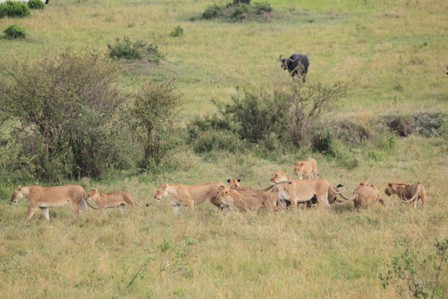 Son gün aslanların buffaloları avlamak için kurdukları tuzağı izledik. 15 20 adet Aslanlabirkaç buffalonun etrafını çeviriyorlardı. Diğer gruptaki Buffalolardan cesaretli olanları aslanların arkadaşlarının etrafını çevirmeye başladıklarını fark edince aslanlara doğru gelmeye başladılar. Böylece bir grup buffalo aslanların yanına gitti. Sıkıyı gören aslanlardan bir tanesi dışında hepsi geri döndü. Buffalolar aslanları kovalamaya başladı.